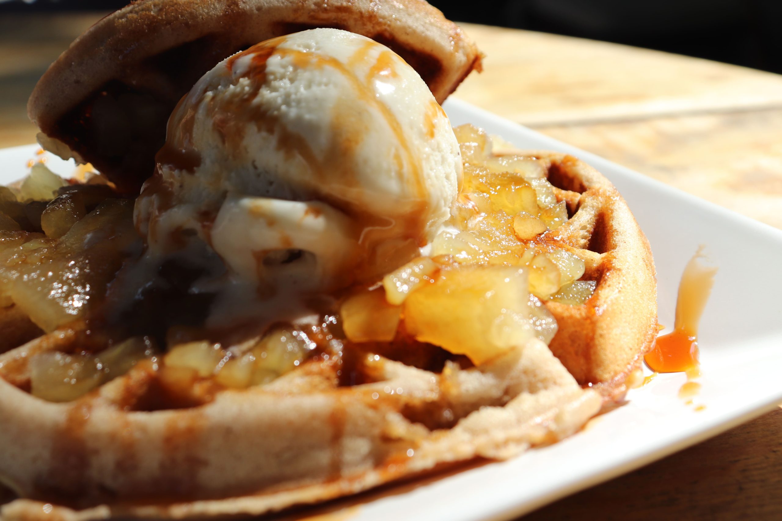 Massa crocante com um toque de canela, servido quente com doce de maçã, uma bola de gelato e calda de caramelo.